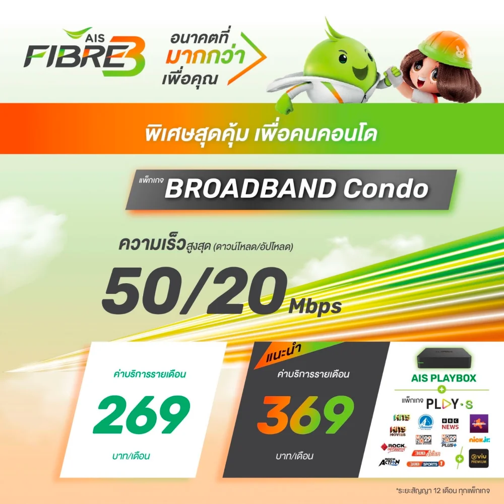 สัมผัสประสบการณ์ออนไลน์เต็มสปีด กับเน็ตบ้าน AIS Fibre ไฟเบอร์ออปติกแท้ 100% ที่เร็ว แรง รองรับทั้งทำงาน เรียน เล่นเกม และ สตรีมมิ่งได้ลื่นไม่มีสะดุด แพ็กเกจเริ่มต้นเพียง 499 บาท/เดือน มีความเร็วให้เลือกสูงสุดถึง 2000/1000 Mbps ครอบคลุมทั่วไทย พร้อมทีมช่างผู้เชี่ยวชาญดูแลคุณอย่างรวดเร็วภายใน 24 ชั่วโมง